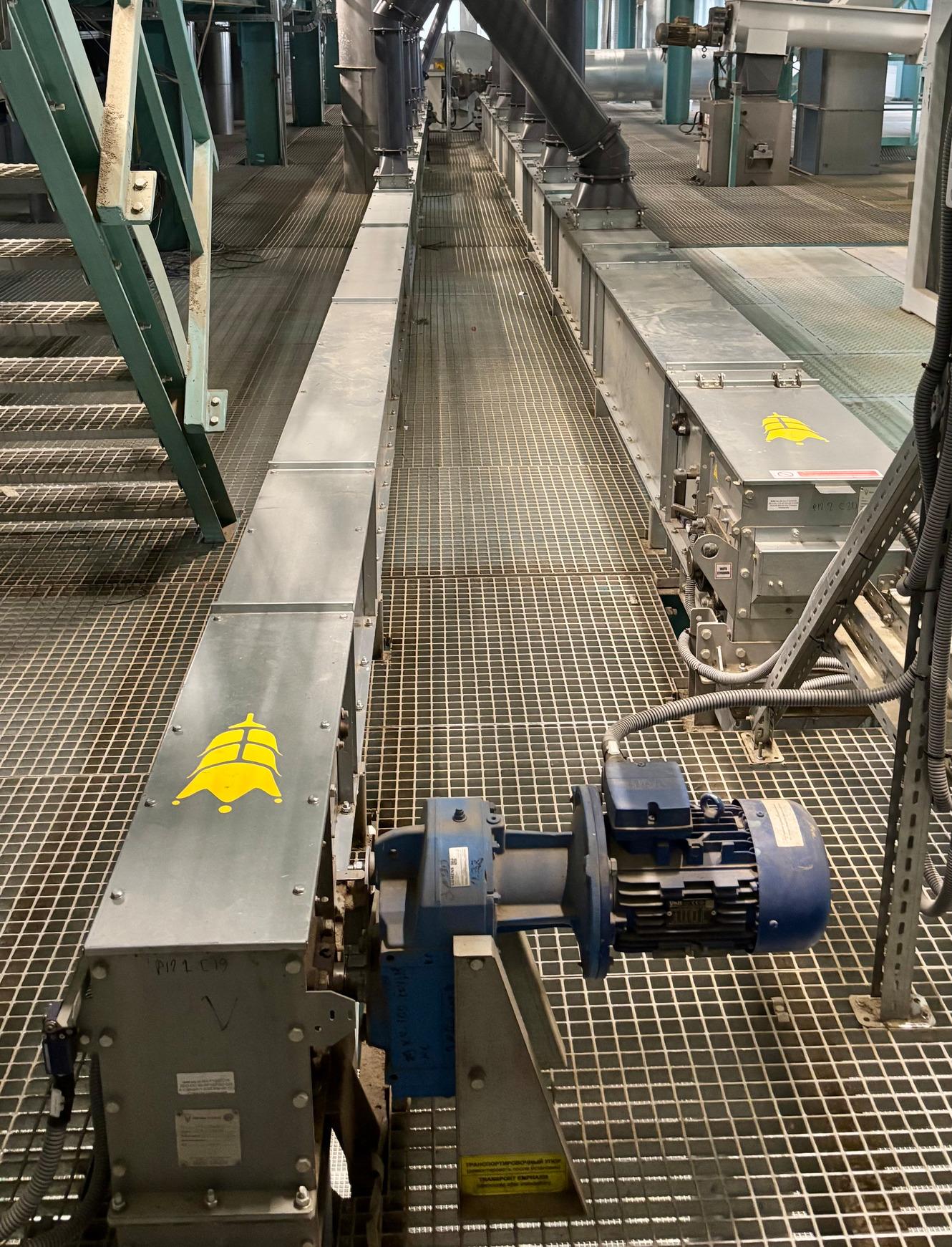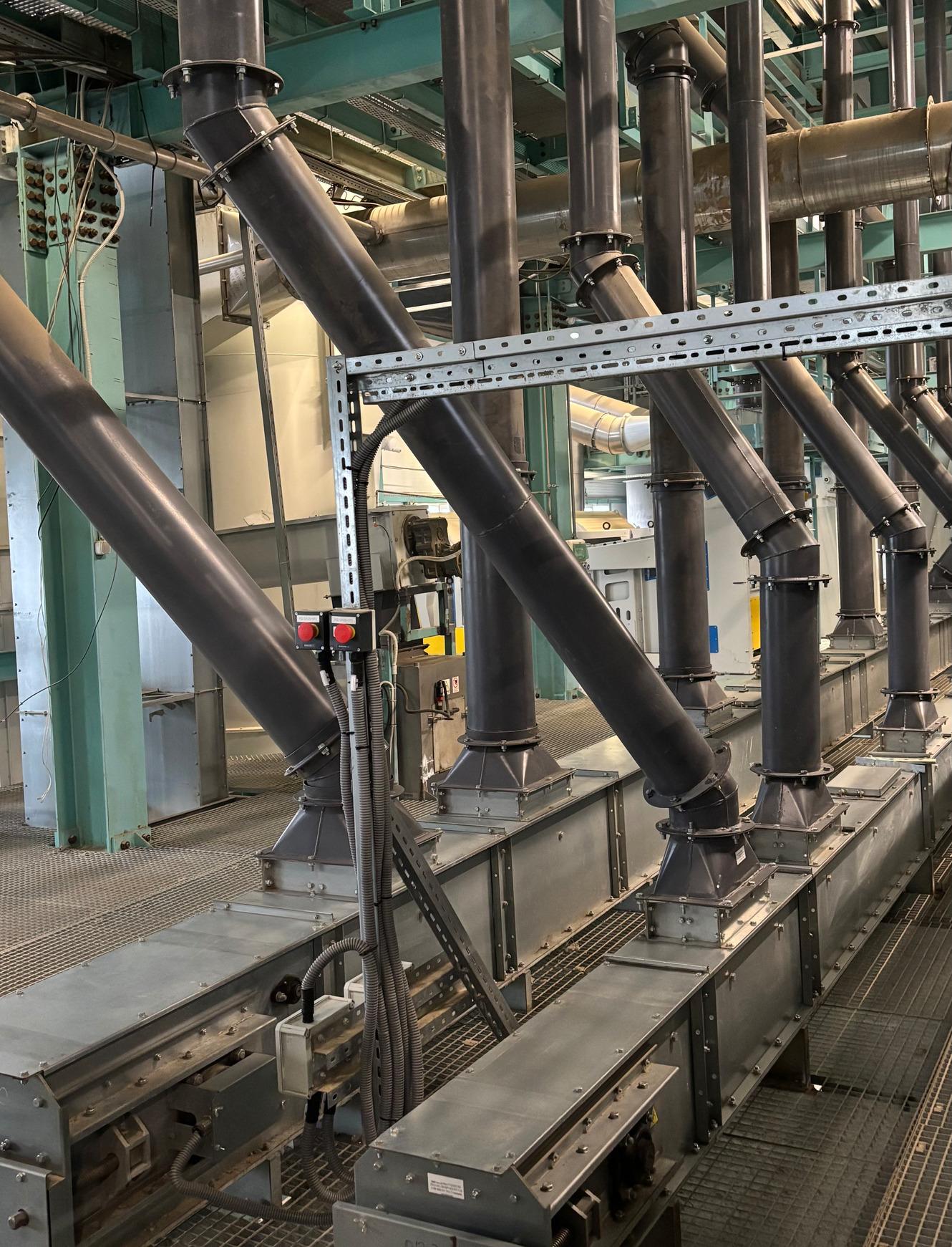 Для таких ділянок корпуси та ланцюги транспортерів виготовили з нержавіючої сталі, а футерування підібрали хімічно стійке та антистатичне. Датчики контролю та підшипникові вузли інтегрували безпосередньо в транспортну систему, що забезпечило надійність і довговічність обладнання в умовах щільної конфігурації цеху.